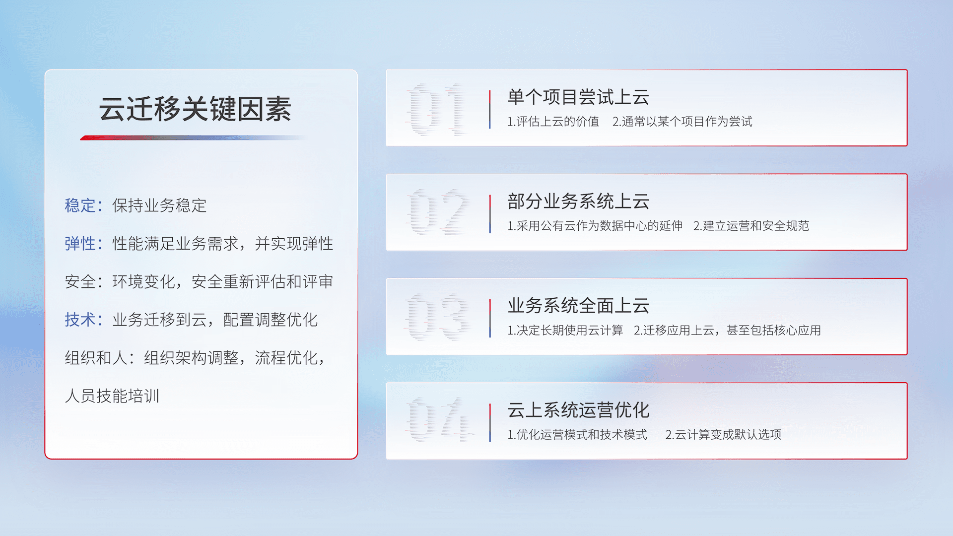 结合实际业务,,从规划设计、、、云平台选型、、、、云原生改造、、数据迁移、、、集成交付,,,迁移全过程为客户识别最佳上云路径,,,,做好风险识别管理,,设计网络架构、、、身份权限、、、、安全审计合规、、、操作审计、、、日志审计、、、、监控告警策略、、、、多站点容灾设计等,,,,对云上基础设施进行整体规划,,,提升IT治理水平,,以满足弹性、、高可用、、高性能的需求。。。