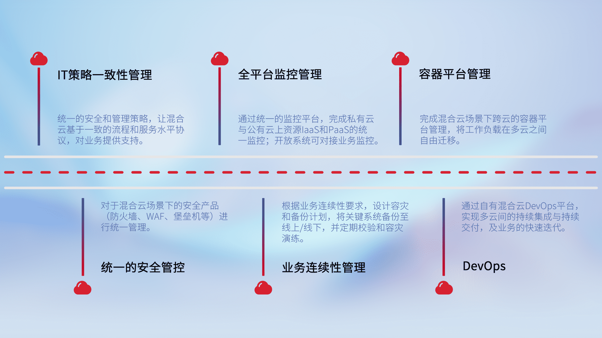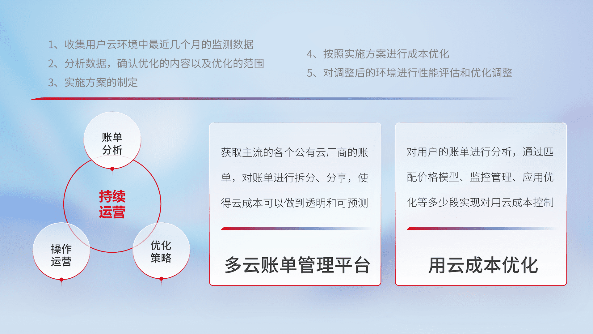 通过多云纳管,,,,以统一的资源数据模型把客户的云资源进行抽象和封装,,,,进而实现对多云资源的统一操作,,保障云资源管理的可靠性、、、、稳定性与可用性。。。。量身定制化运维内容,,,,配置、、、开发运维、、、补丁管理、、、备份、、监控、、、认证和访问管理、、、审计和日常巡检等,,,保障在用云过程中的可靠度,,稳定度以及高可用率。。。。
